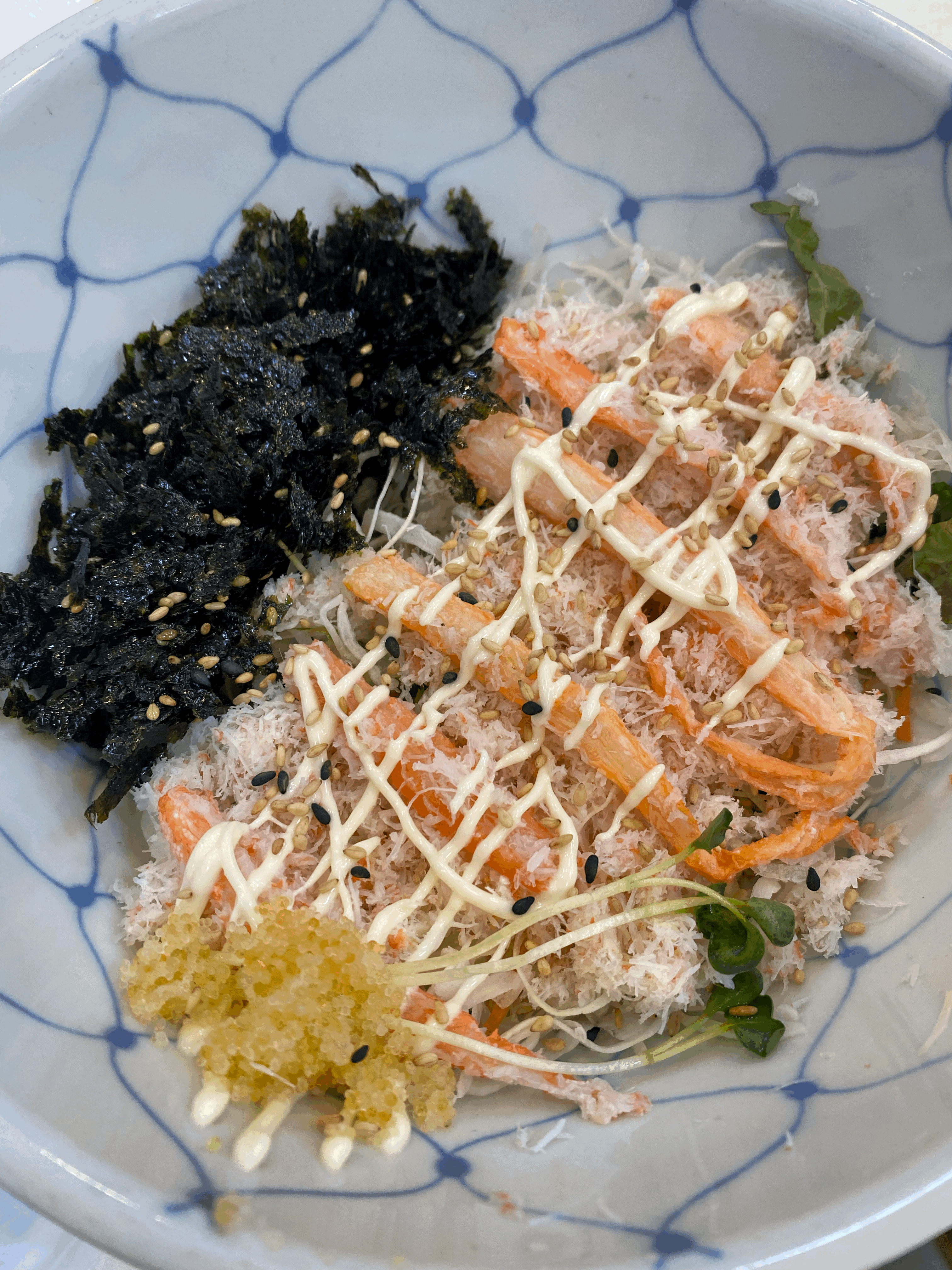 물회와 함께 게살 비빔밥, 오징어순대를 주문했습니다. 회를 못 먹는 지인이 있어서 게살 비빔밥을 주문했는데요. 날 것을 좋아하지 않아 회를 싫어하는 사람도 있지만 회에도 비린맛이 난다고 해서 못먹는 분들이 꽤 있더라고요. 게살 비빔밥도 약간의 비린맛이 있기 때문에 지인은 먹지 못했는데 저는 눈 뒤집히며 먹었습니다.