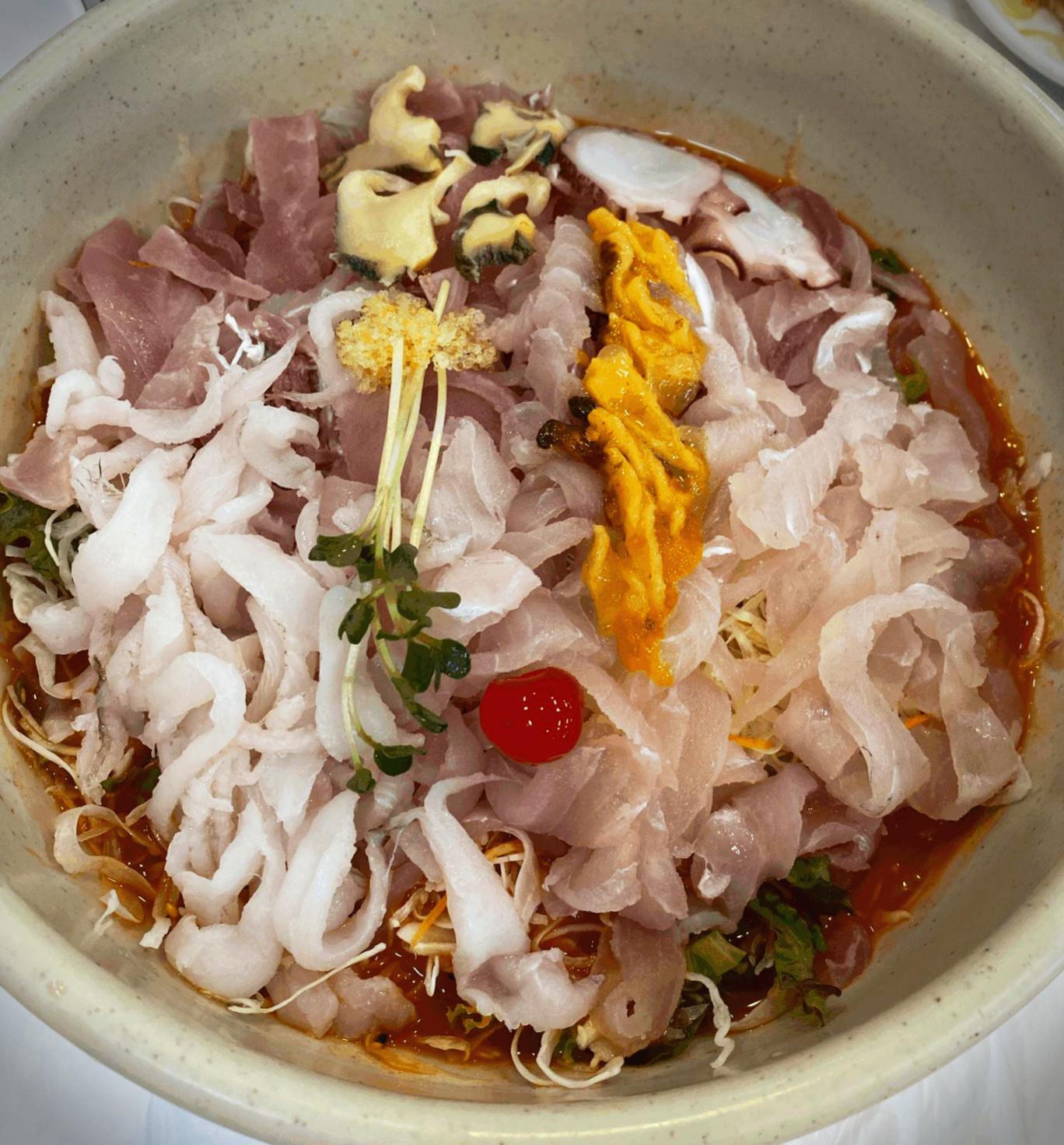 구구집에서 주문한 물회가 나왔습니다. 얼음이 많은 편은 아니고 다른 물회 집보다 신맛은 강하지 않으며 매실 맛 때문에 감칠맛이 더 느껴졌습니다. 활어회와 해산물이 굉장히 신선하고 양이 엄청 많아서 가성비도 정말 좋은 것 같아요. 다른 물회 집에서 먹다 보면 질린데 소스가 달라서 그런지 질리지 않고 먹을 수 있었습니다.