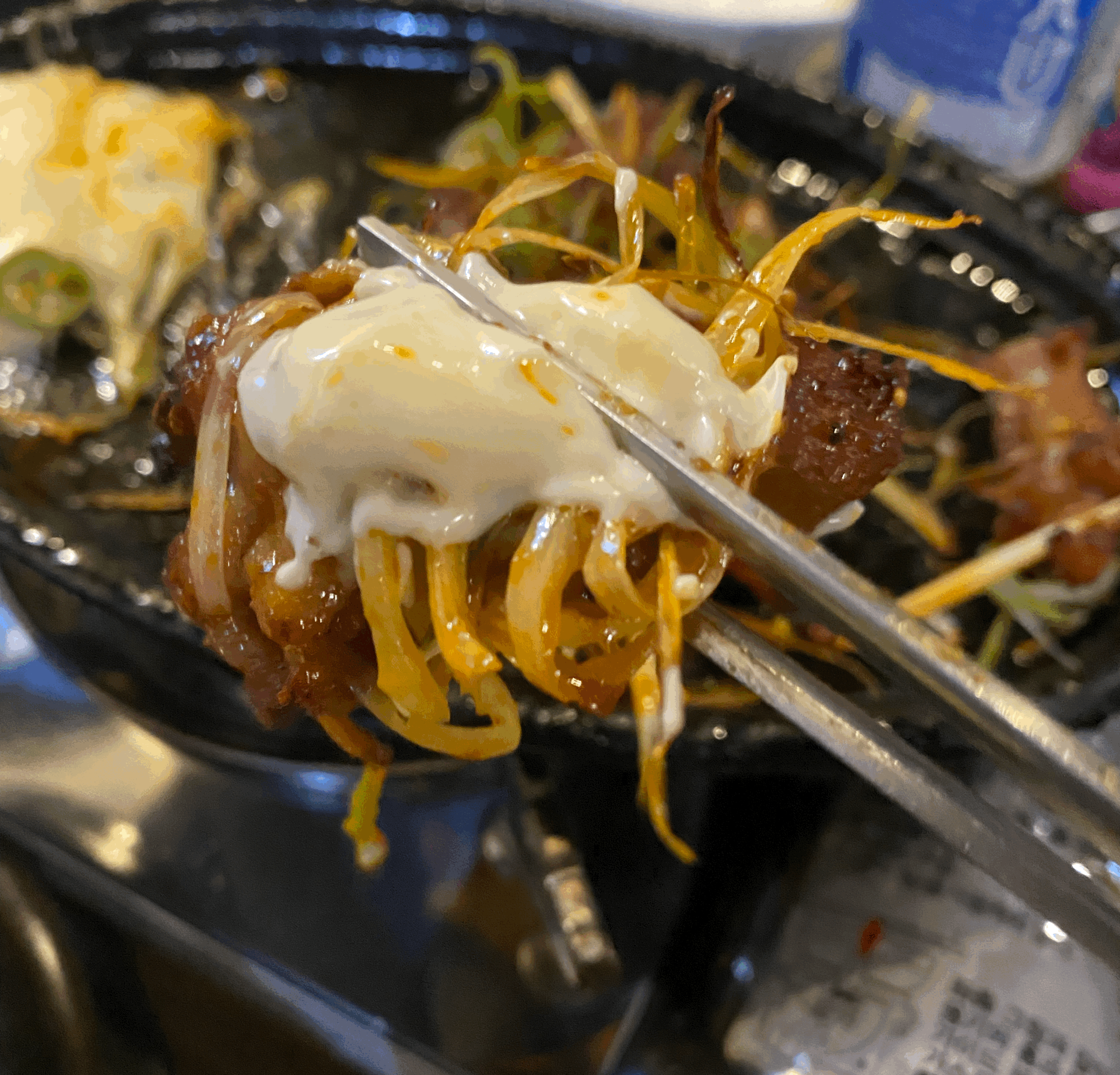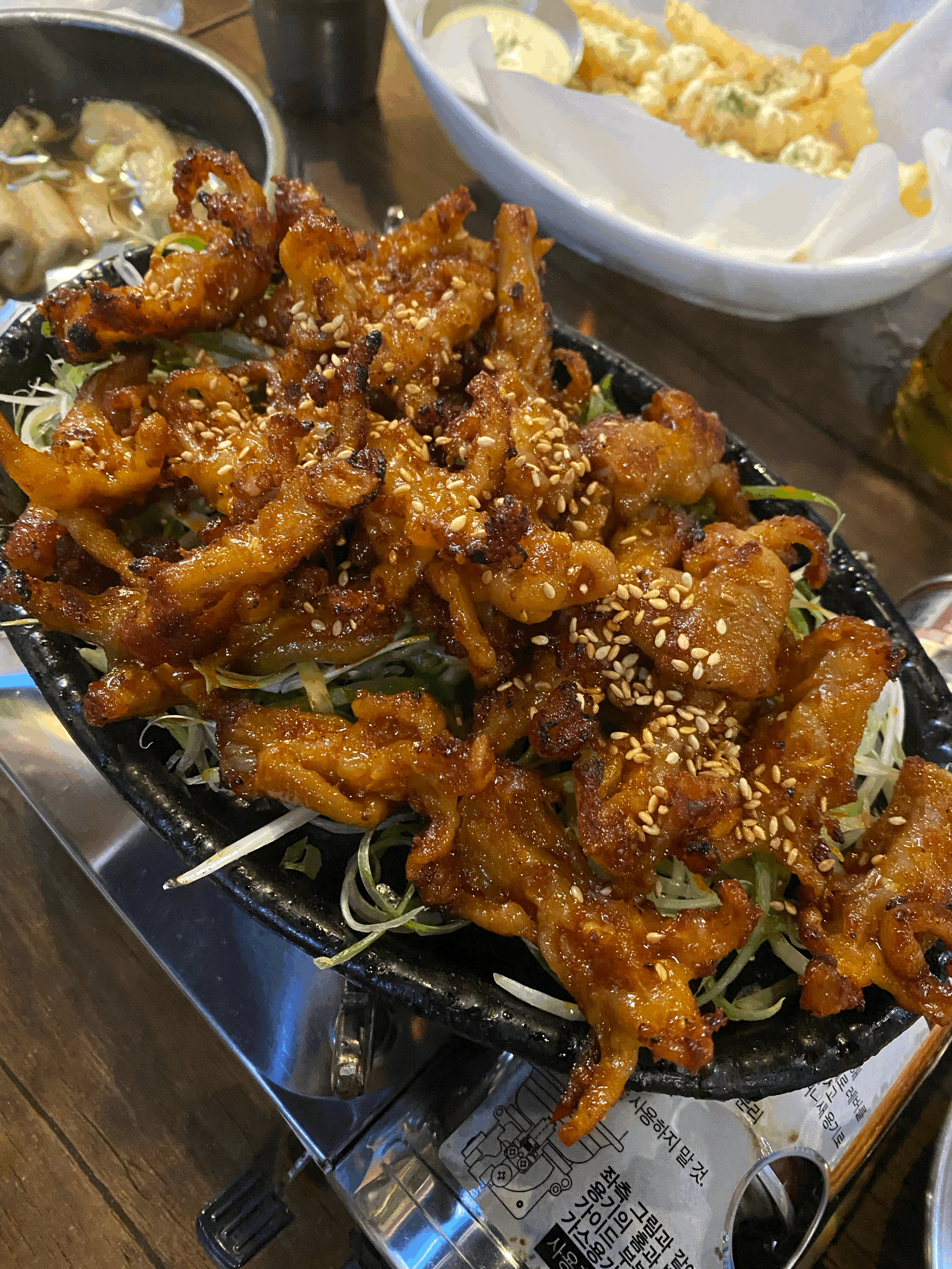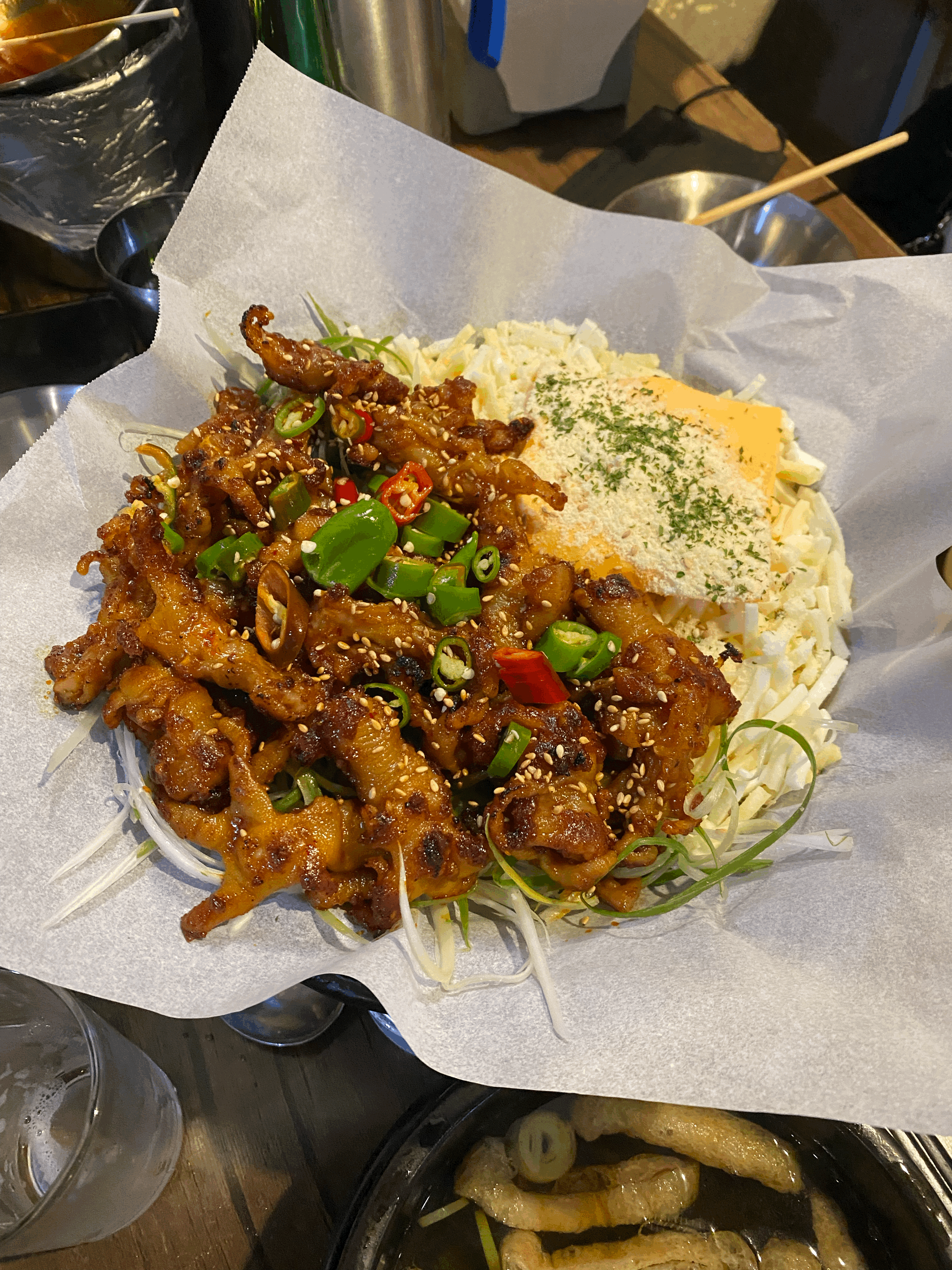 주문한 치즈 무뼈 닭발과 직화 무뼈 닭발이 나왔습니다. 버너 위에 살짝 불을 키운 다음 자글자글하게 먹는데 맵지도 않고 비리지도 않고 너무 맛있습니다. 닭발 아래 파채와 함께 곁들여서 드시면 됩니다. 치즈 닭발은 치즈와 함께 드시면 매운맛이 좀 덜한 것 같습니다.