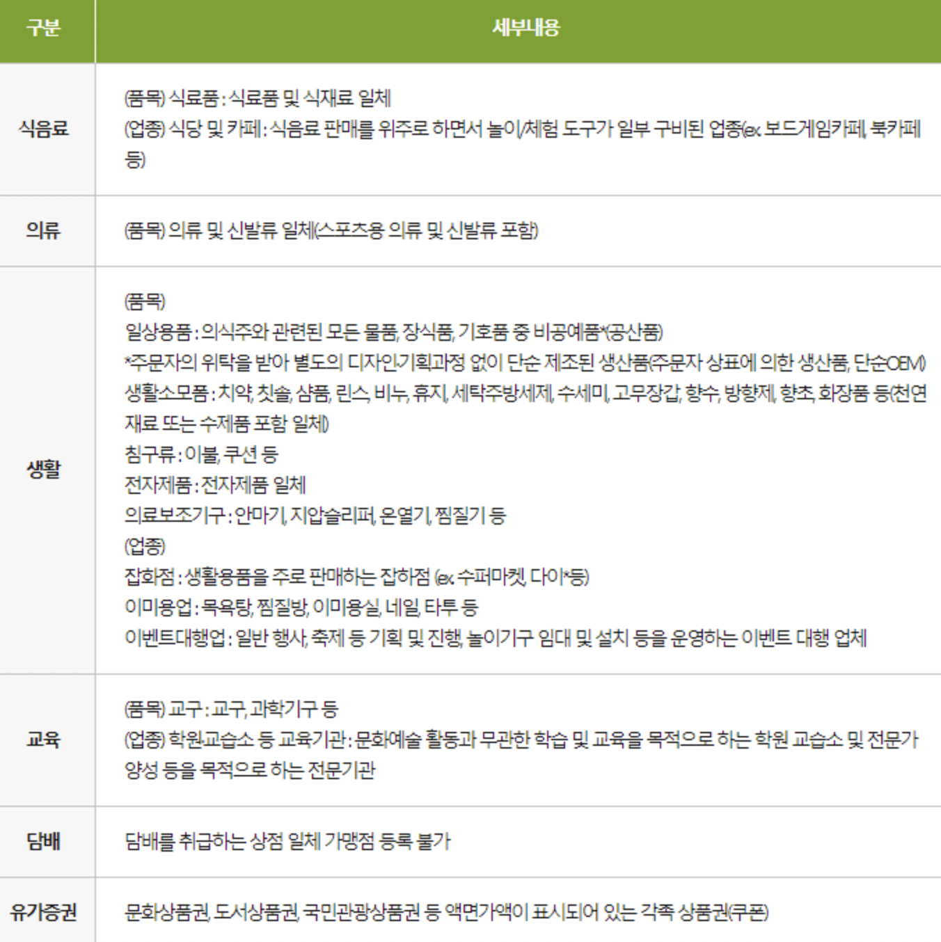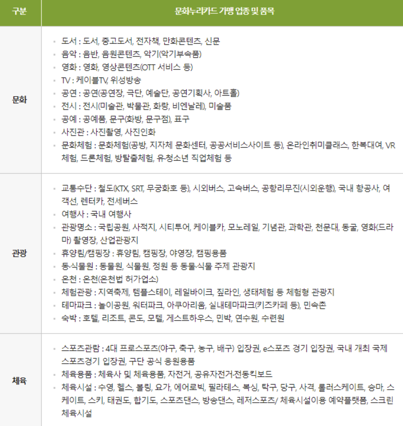 문화누리카드는 등록된 가맹점에서만 결제가 가능합니다. 카드로 결제할 수 없는 곳에서 현금으로 전환하여 사용하실 수 없습니다. 직접 명시하지 않은 업종 품목 의 이용 가능 여부는 본 지침의 전반적인 내용과 사업 목적 및 지원 지침의 부합하는지를 종합적으로 검토하여 판단하고 사용해야 합니다.