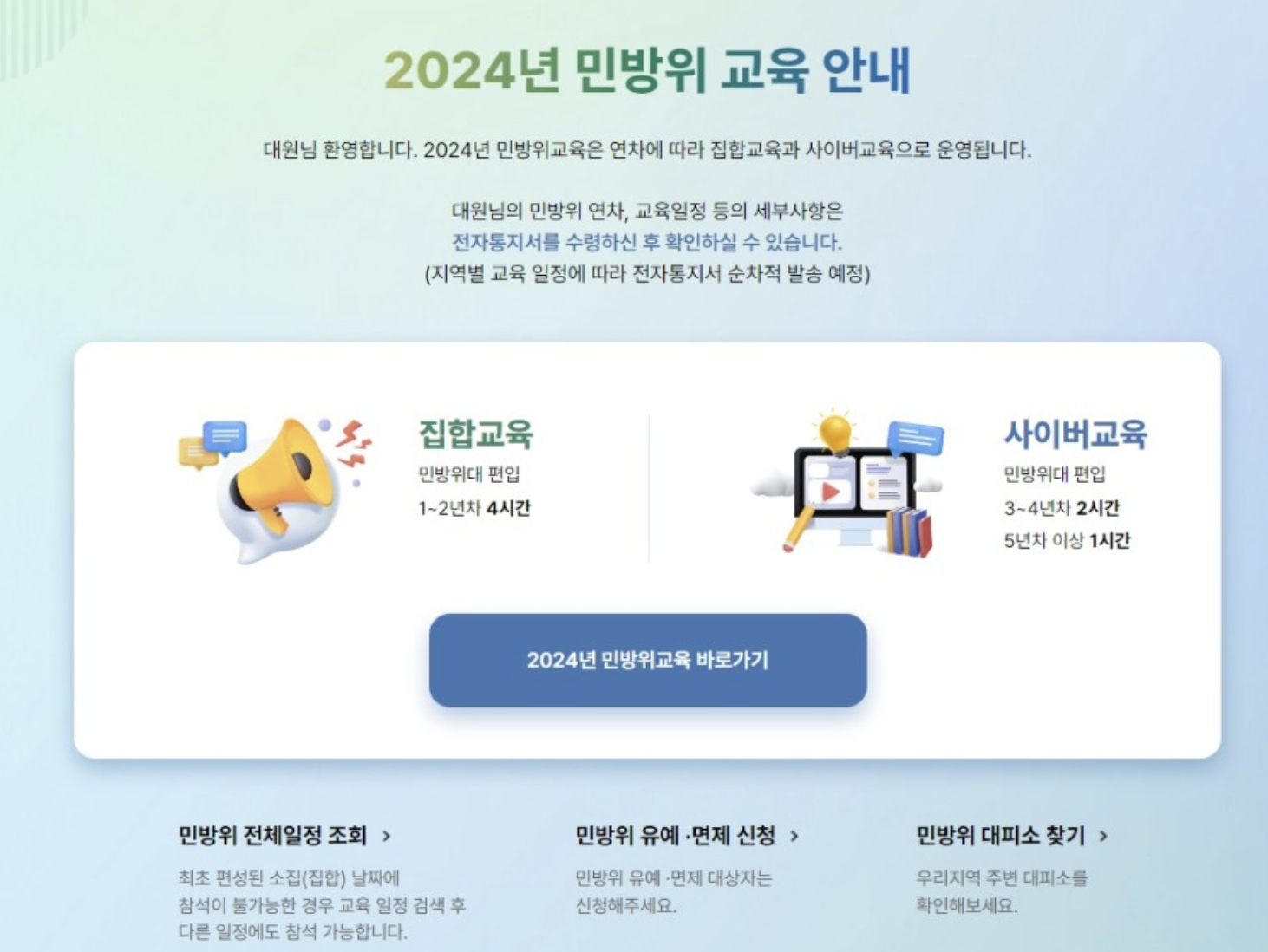 전국 지자체별 민방위 집합교육 전자출결 서비스, 전자 출결용 QR 및 교육참가 이수증 제공, 전자 통지서 확인가능, 민방위 교육일자, 소집 교육장소, 전국 집합교육 일정 조회, 온라인 문의