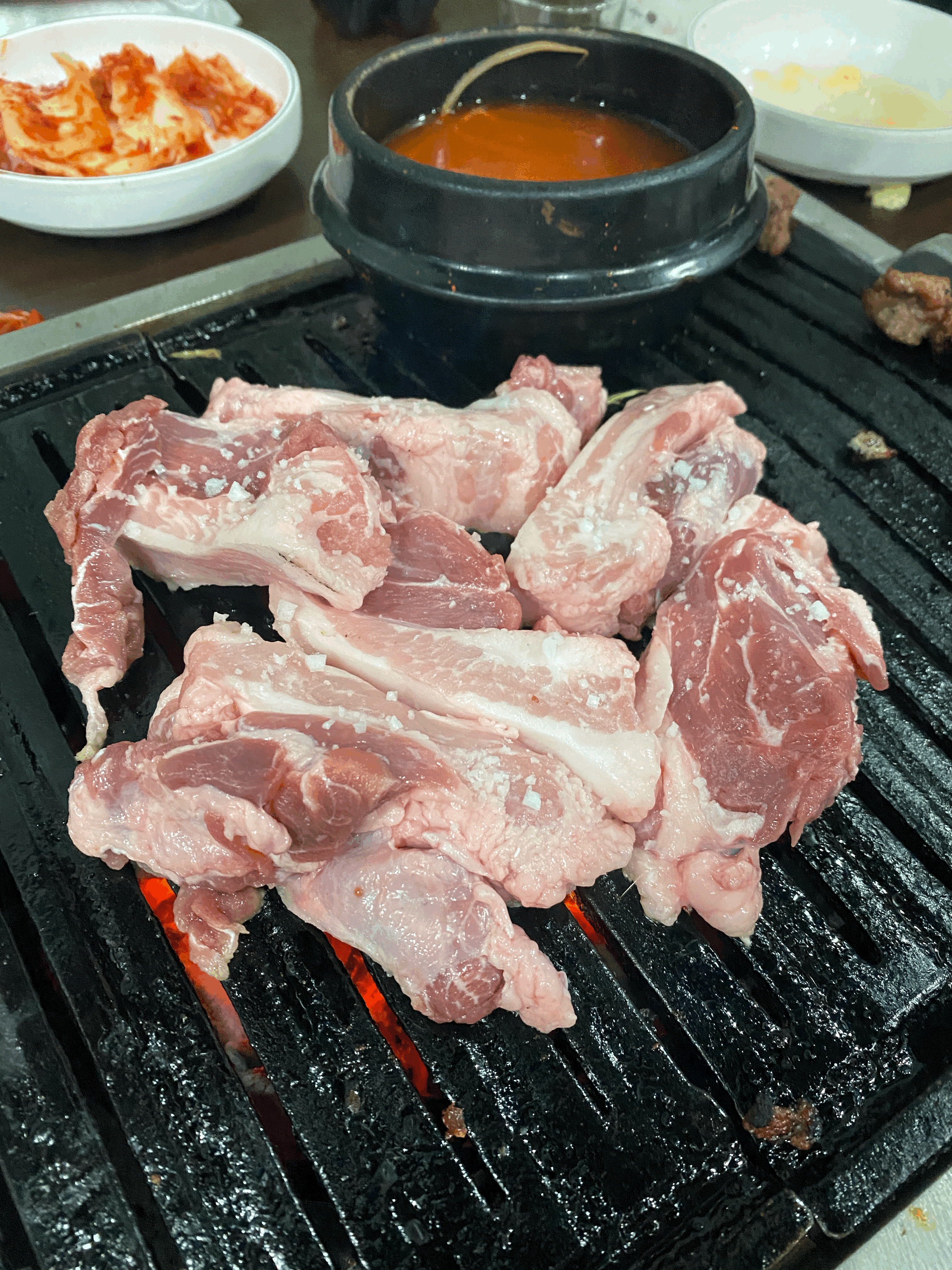 오돌뼈를 주문 시 밑반찬은 파절이, 고추냉이 간장소스가 인당 나오게 되고 마늘, 쌈, 된장도 준비됩니다. 불판은 특이한데요 4개로 나뉘어 있어 가운데 2개 불판 먼저 굽다가 다른 음식을 주문하게 되면 탄 불판은 사이드로 밀고 다시 새 불판을 가운데로 옮기고 있습니다!