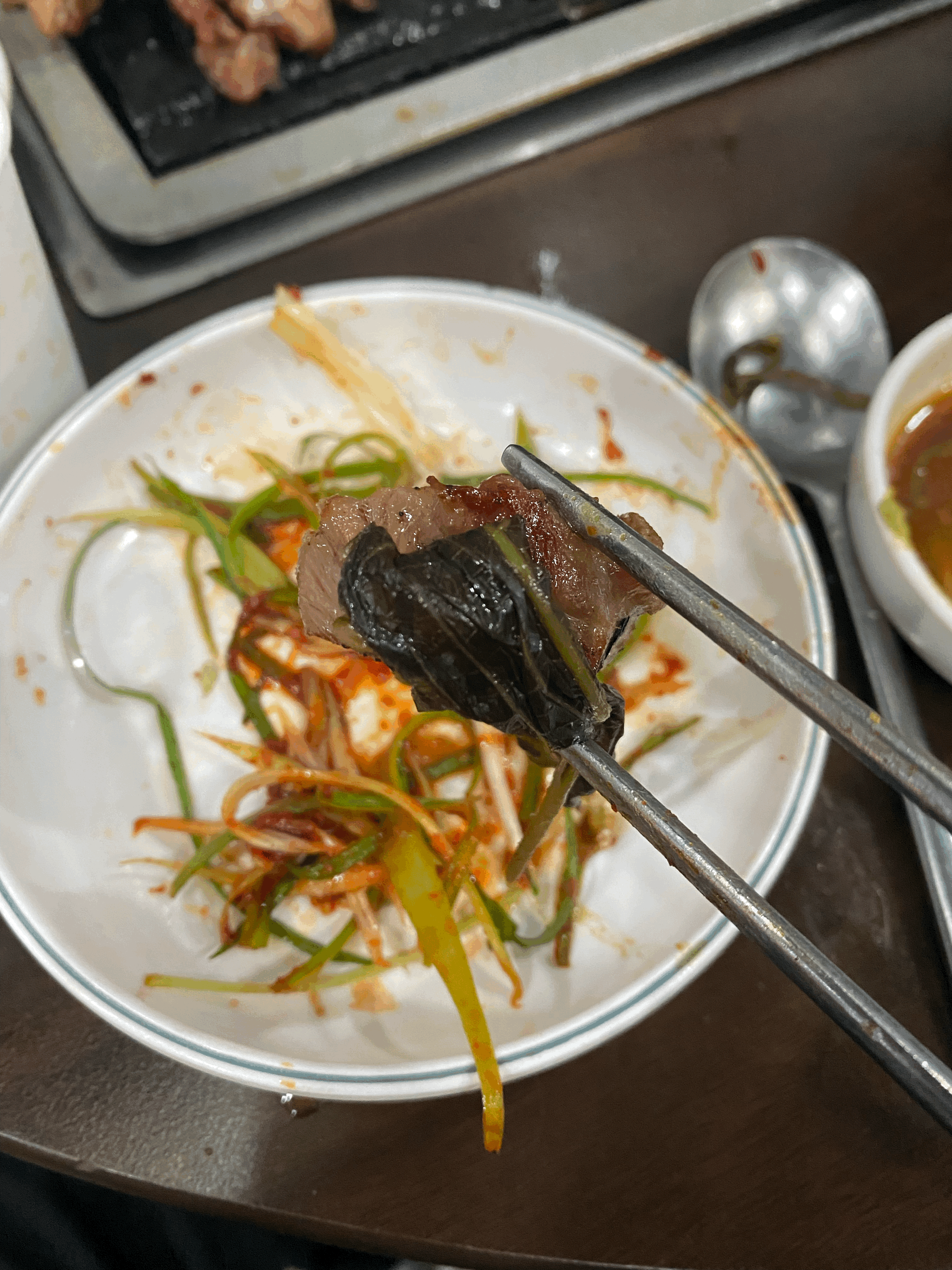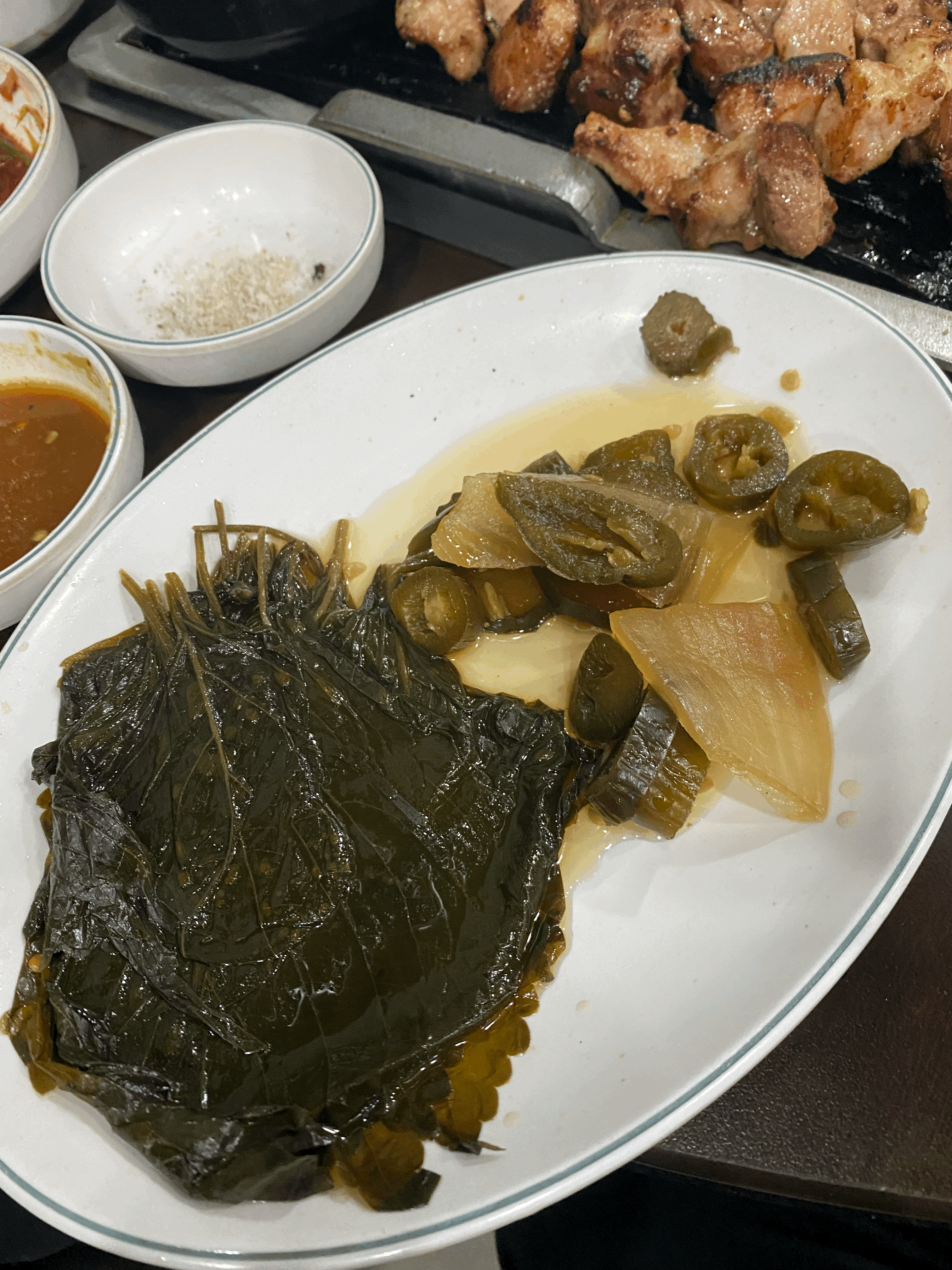 뒷고기를 주문하면 깻잎절임, 할라피뇨?? 와 같은 야채가 나오는데요. 뒷고기랑 함께 싸 먹으면 기름진 맛을 또 잡아주면서 간도 되어 맛있게 드실 수 있습니다. 이런 궁합은 어떻게 찾으셨는지 궁금합니다.