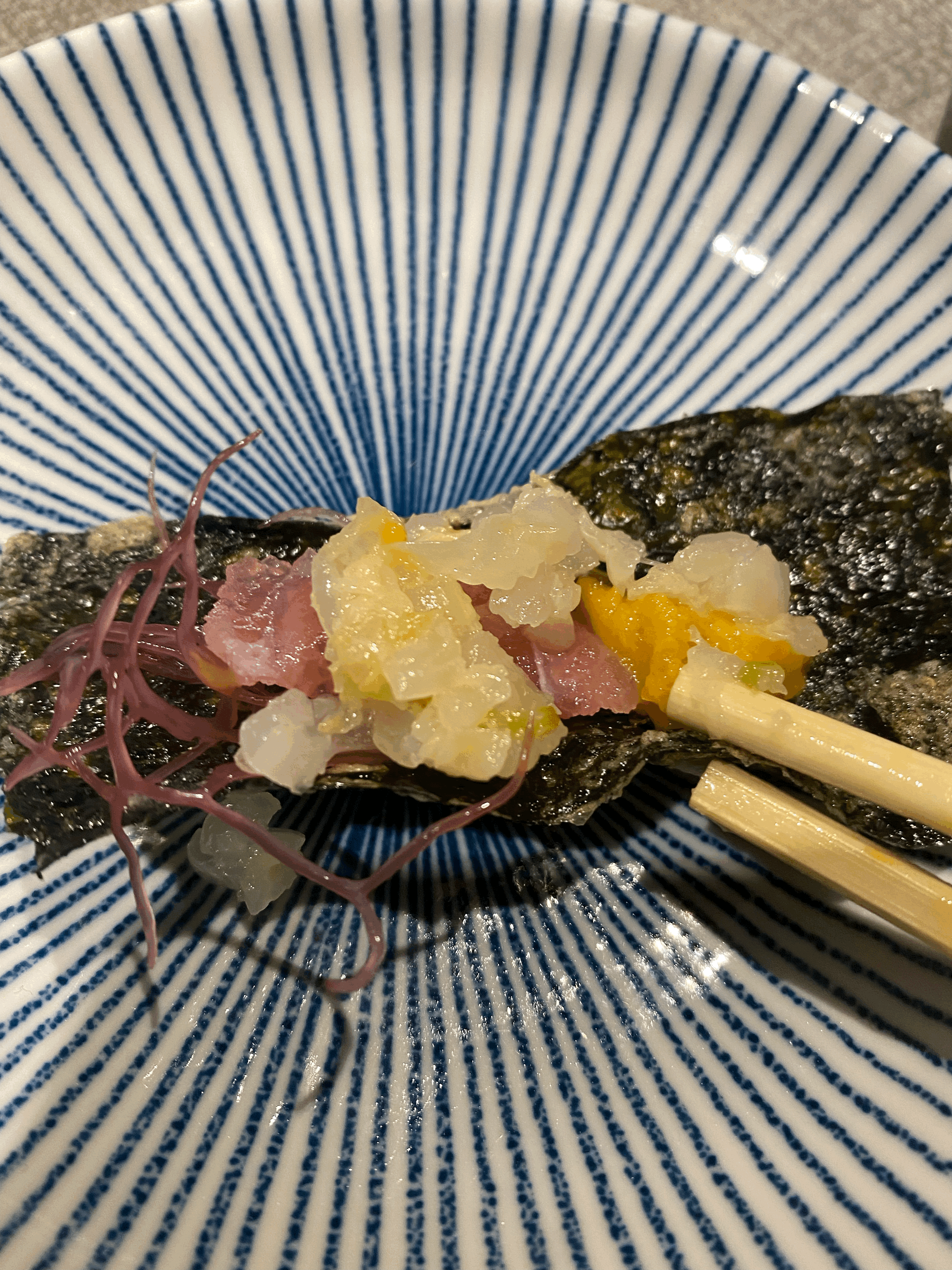 드디어 나온 참치각에 우니 추가 요청으로 참 치우니 각? 이 나왔습니다. 처음 나왔을 때 이 모습을 망가뜨리고 싶지 않은 플레이팅이었어요. 위에 흰색은 절여진 양파이고 아래쪽에 잘게 썰어진 참치들이 있습니다. 위에는 청어알이 있고요. 부각에 참치, 양파, 우니를 싸서 먹었는데 자극적일 줄 알았지만 전혀 자극적이지 않고 깔끔하게 느껴졌습니다.