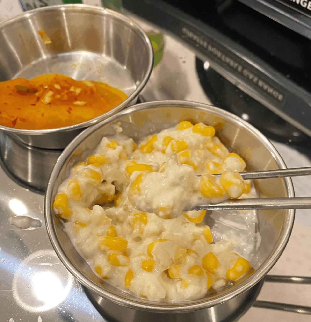 밑반찬은 많지 않고 적당하게 콘샐러드와 단무지가 나오는데 일반 콘샐러드라고 생각하고 안 먹고 있다가 지인이 아무 말 없이 계속 집어먹길래 김치 곱창전골이 나오기 전에 나도 한입을 먹어보았다. 그런데 일반 마요네즈가 아닌 감자 샐러드인지 일반 마요네즈가 아닌 식감과 콘의 궁합이 너무 잘 맞았다. 몰래 계속 혼자 먹고 있던 지인이 너무 웃겼다. 묘한 매력이 있어 계속 집어먹게 되는 밑반찬이었다.
