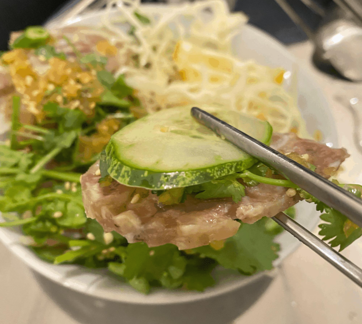 김치 곱창전골은 익어서 나오지만 끓는걸 한번 보고 먹어야겠다 싶어 기다리는데 중 서비스 오향 편육이 나오게 됩니다. 서비스 치고 굉장히 만족스럽게 나오더라고요. 기본적으로 양파, 오이, 고수, 고추, 편육, 마늘이 섞여서 나오게 되는데 고수를 싫어하시는 분이면 호불호가 갈리겠다 싶었습니다. 애초에 같이 나오는 음식이기 때문에 고수를 진짜 싫어하시는 분들은 향도 싫어하시더라고요. 저는 중국에 2달 가까이 있었기 때문에 고수는 저에게 아무런 방해가 되지 않았어요.