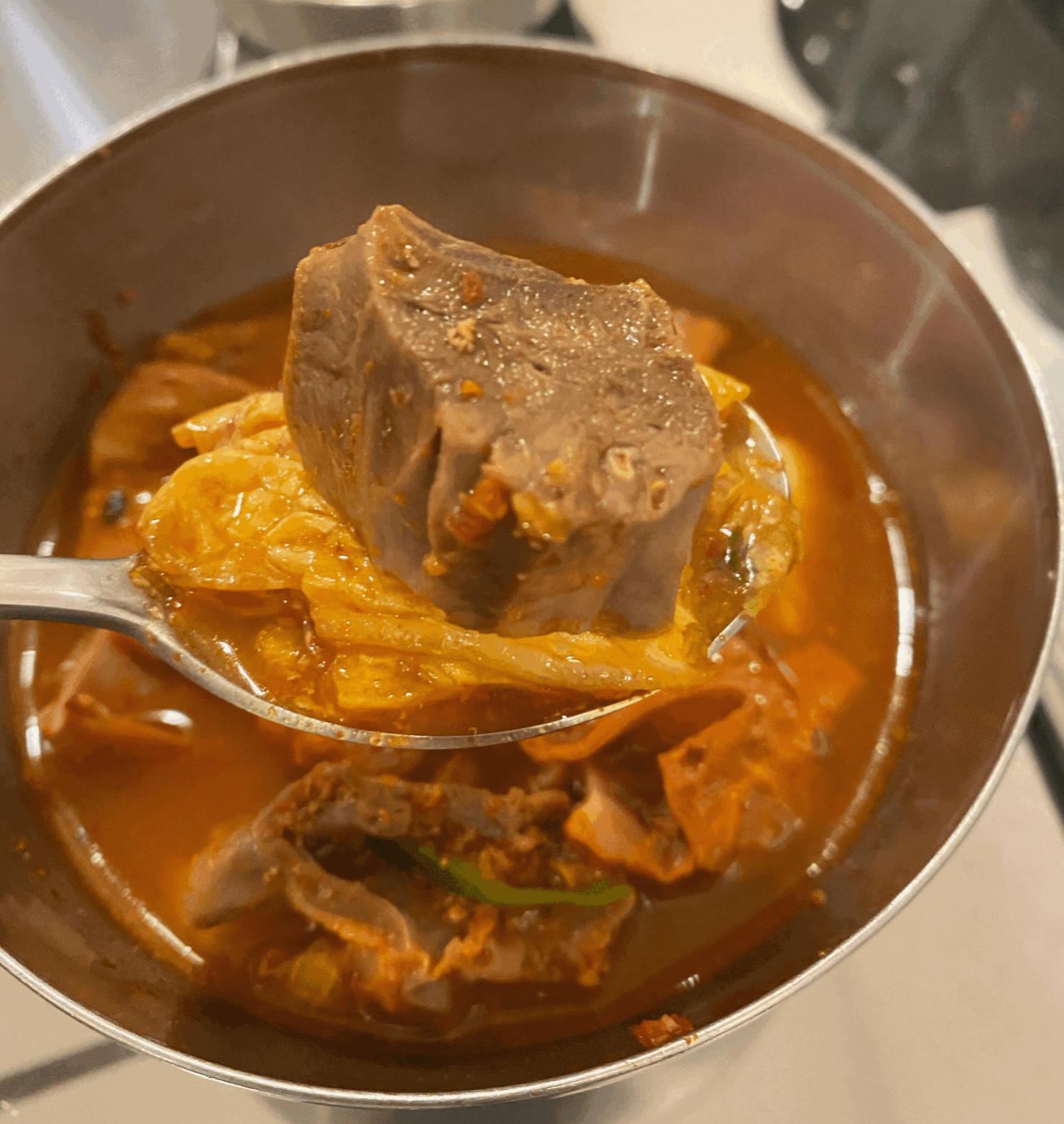 일단 편의점 편육 느낌이지만 오이와 고수, 고추, 양파를 곁들이면 너무 맛있었습니다. 본 메뉴가 끓기도 전에 술 한잔 하면서 오향 편육을 다 먹었어요. 또 주문할까 많이 고민했지만 대표 메뉴를 먹기 전이다 보니 추가 주문은 하지 않았습니다.