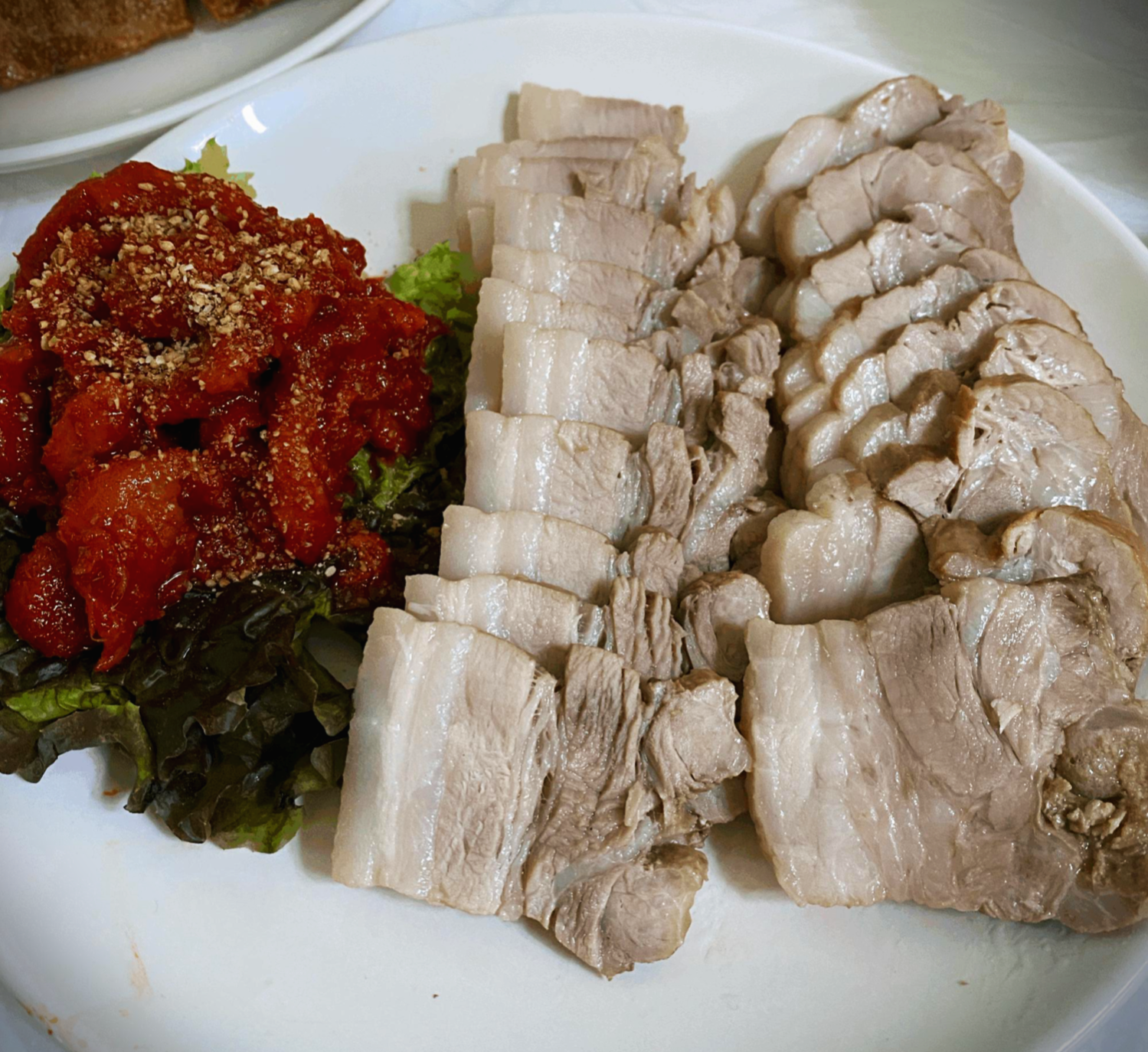 다음으로 주문한 범바위 막국수 수육이 나왔습니다. 수육과 명태회를 곁들일 수 있도록 같이 나오게 되는데요. 퍽퍽한 살이 전혀 없고 잡내도 하나 없습니다. 정말 잘 삶은 돼지고기에 명태회와 이전에 나온 야채들을 곁들이면서 막국수와 같이 먹으니 너무 맛있었습니다. 명태회 자체만으로의 간도 적당하기 때문에 수육과 명태회만 먹어도 맛있게 먹을 수 있었습니다.