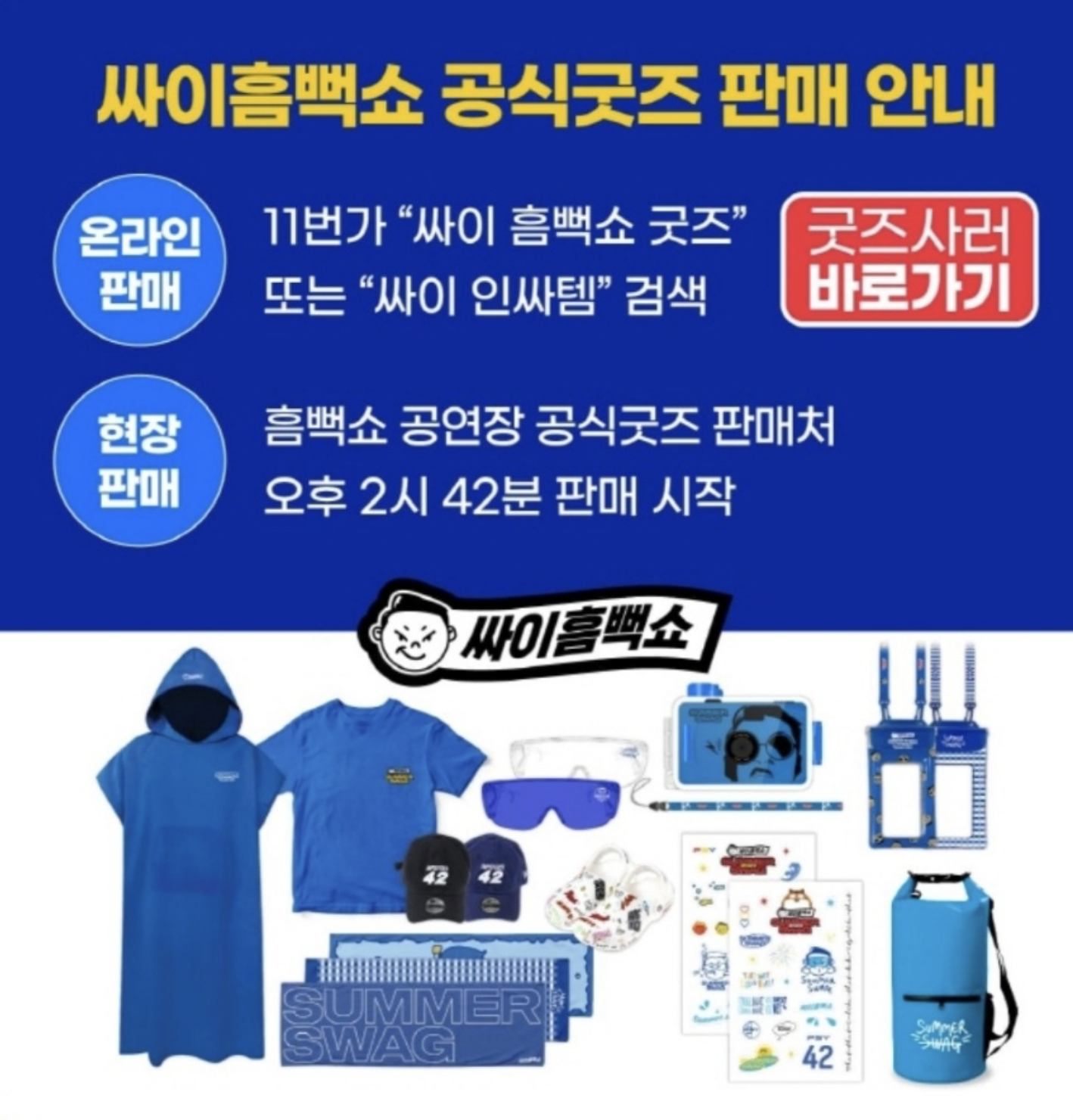 이번 싸이 흠뻑쇼 2023 공식 굿즈는 우비, 물안경, 티셔츠, 핸드폰 방수팩 등이 판매되고 있습니다. 공연장 당일 현장에서 발광 너클밴드가 무료로 제공된다고 합니다. 드레스 코드가 포싸이돈은 파랑을 선호한다고 합니다.