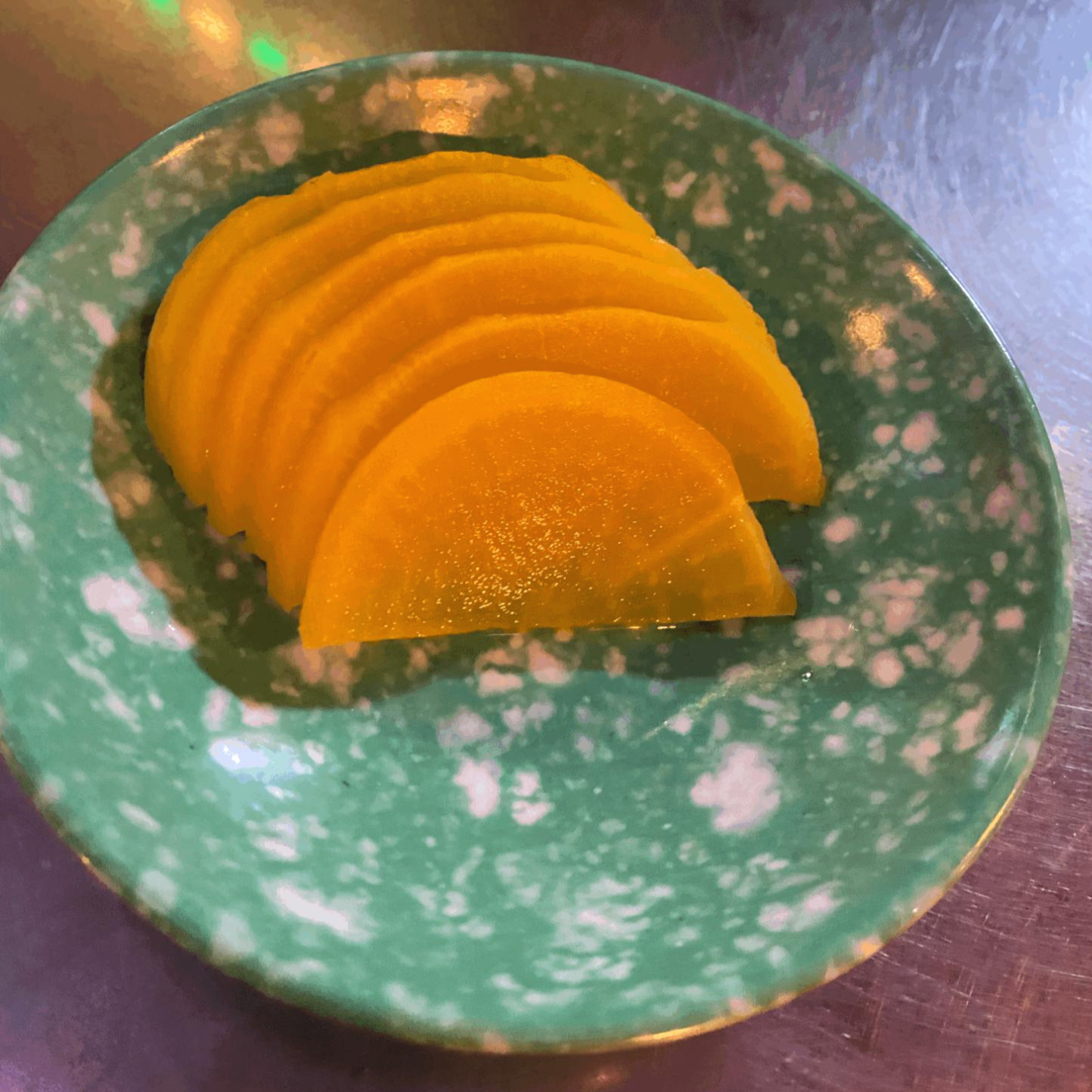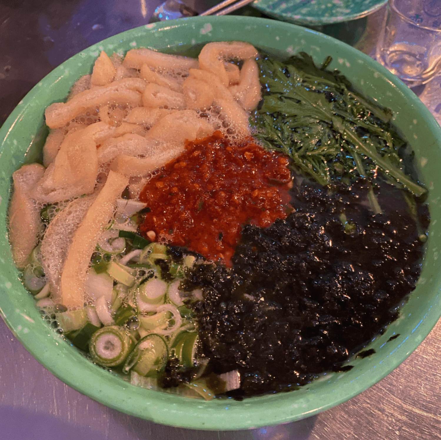 매운 다진 양념, 김가루, 유부, 쑥갓이 들어간 땡고추 우동과 단무지가 나왔다. 너무 매워서 다음날 배가 아프지 않을까 싶었지만 칼칼함 속에 왠지 배가 아프지는 않을 것 같은 맛이었다. 이 가격이라면 식사로 먹어도 될 정도로 술안주라고 자극적이지 않고 괜찮았다. 보통 이 정도 퀄리티라면 7~8천 원 할 텐데 굉장히 만족스러웠다. 포장마차나 우동 집에서 맛볼만한 우동 맛이었다.