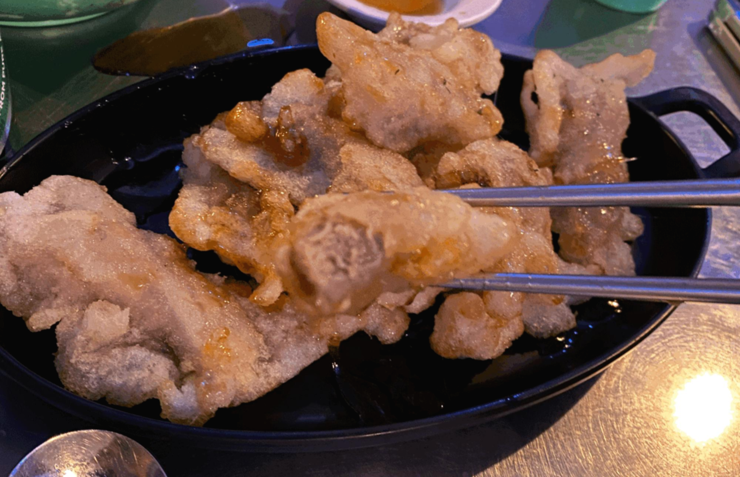 일단 처음 나왔을 때 비주얼은 다른 탕수육 판매하는 곳과 별다른 건 없었다. 나왔을 때 탕수육 소스와 튀김 향이 굉장히 침샘을 자극했다. 한입을 먹고 지인과 둘이 감탄을 하면서 가락국수보다 빠르게 흡입했다. 그냥 탕수육이 아닌 찹쌀 탕수육이다. 보통 치킨가라아케나 다른 탕수육 집에서 먹을 때 속은 꽉 차지 않고 튀김이 대부분인 경우가 많은데 여기는 속이 꽉 찼다. 탕수육 맛집인 것 같다. 안에 고기로 꽉 차 있고 잡내도 없다. 술집에서 판매할 정도가 아니라며 지인과 탕수육 하나로 엄청 많은 얘기를 나눈 것 같다. 탕수육 추천해요!