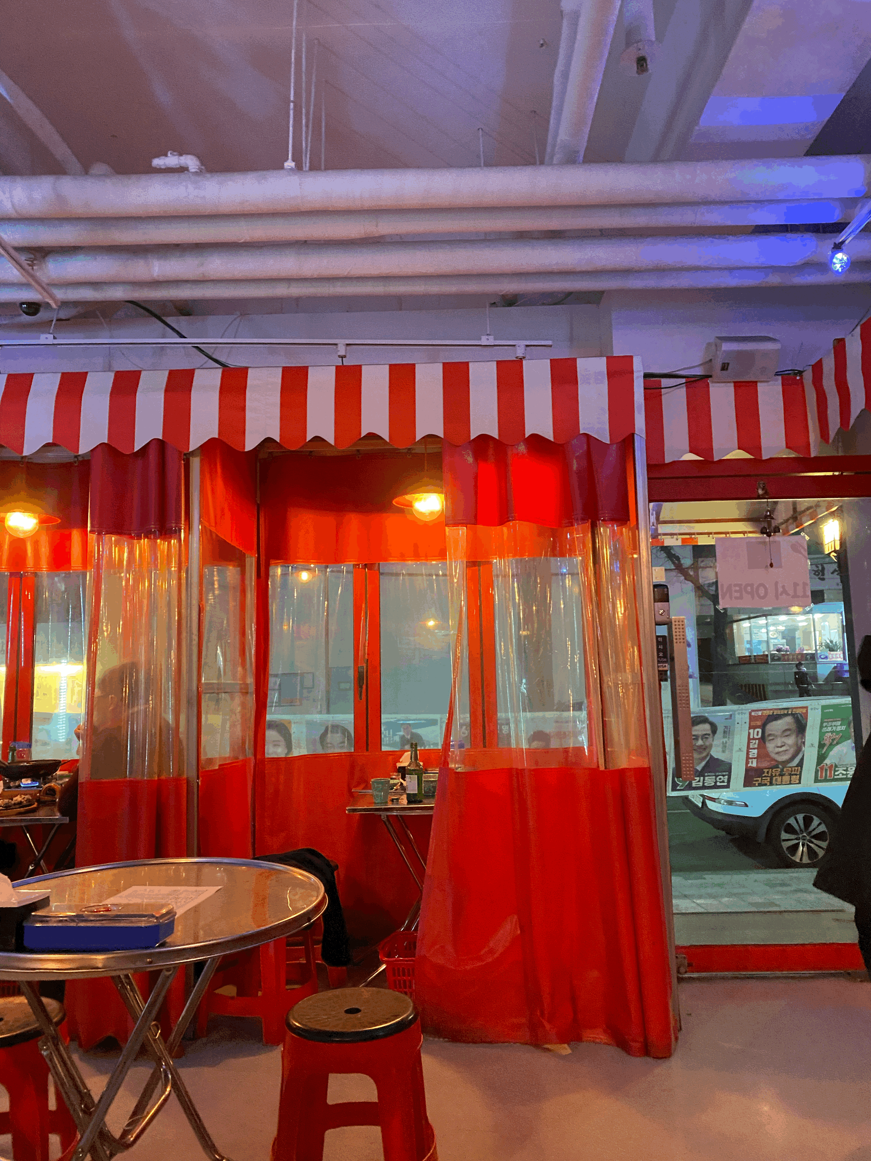 집 앞에 가성비 좋고 맛집을 찾아 기분이 너무 좋다. 테이블당 최대 4명 정도 앉을 수 있고 포장마차로 인테리어 된 테이블에는 최대 3명 정도 앉을 수 있을 것 같다. 과하지 않고 소소하게 한잔 하기 좋은 술집이다.