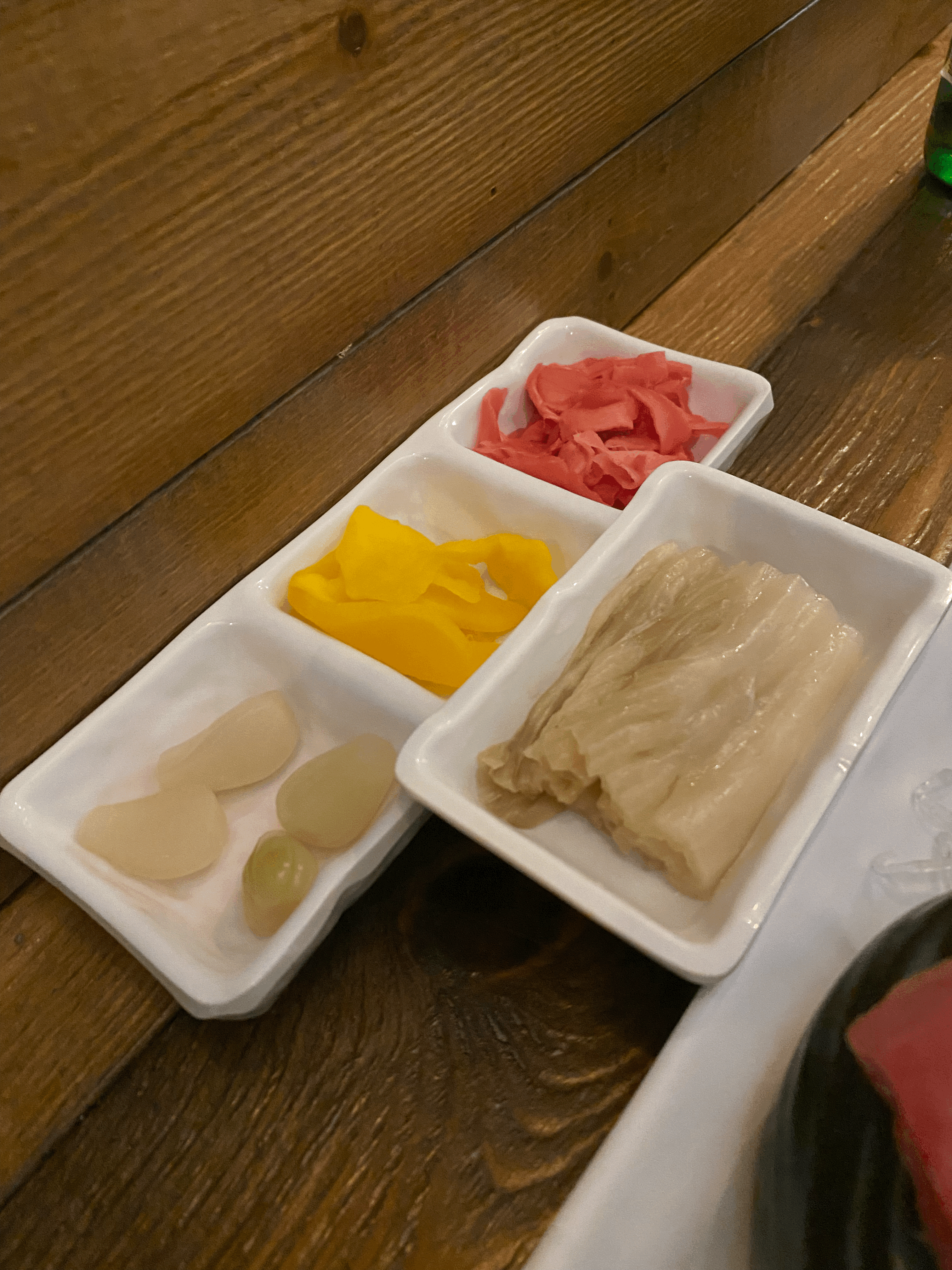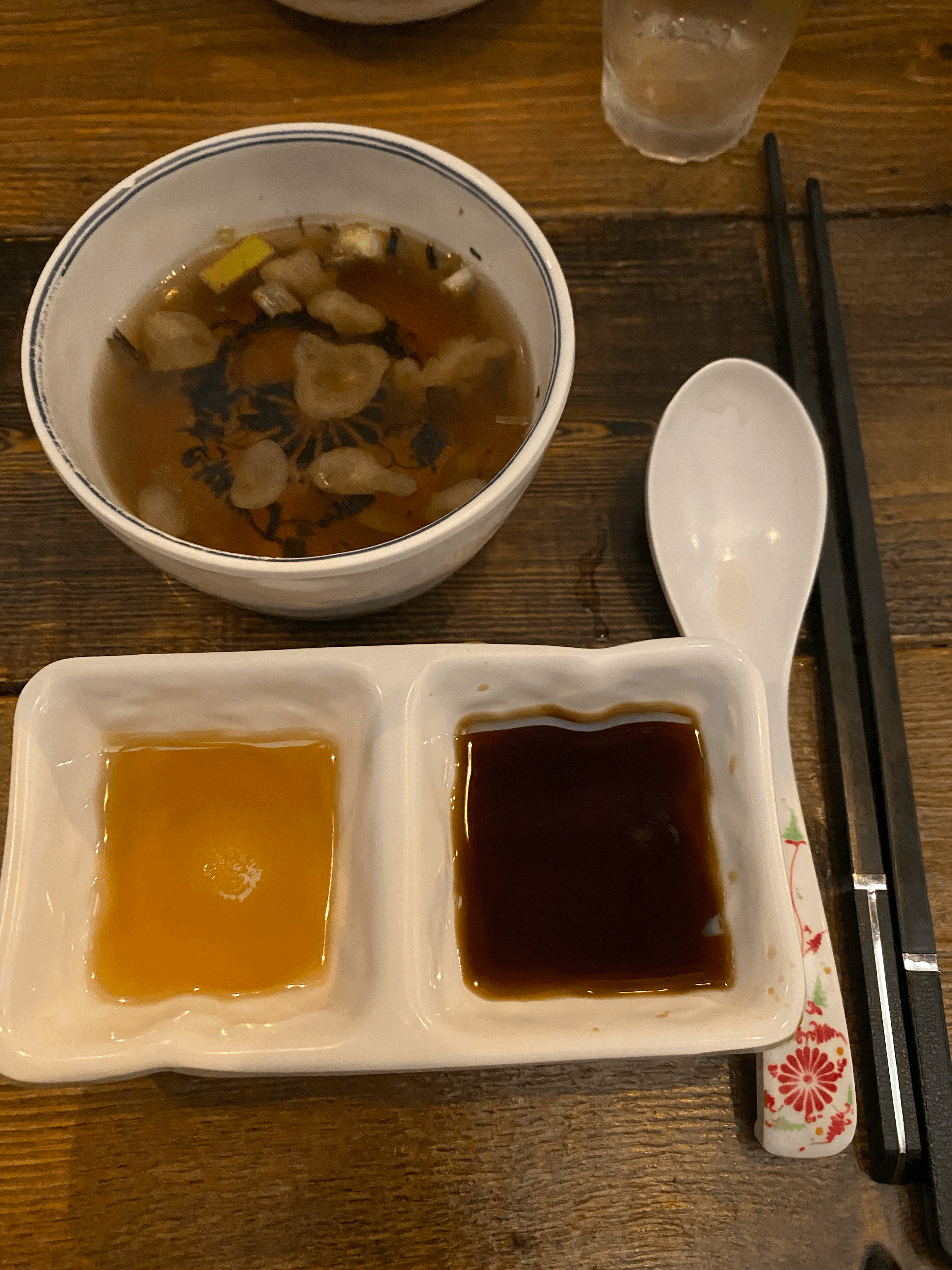 밑반찬으로 묵은지, 간장과 참기름장, 생강과 단무지, 락교, 국물이 나오고 있다. 혼술에 적합한 곳이라는 가장 강력한 골목 참치만의 매력은 테이블마다 배치되어 있는 콘셉트와 usb 포트이다. 사진은 촬영하지 못했지만 이런 디테일 하나하나 인테리어 곳곳에 숨겨져 있다.