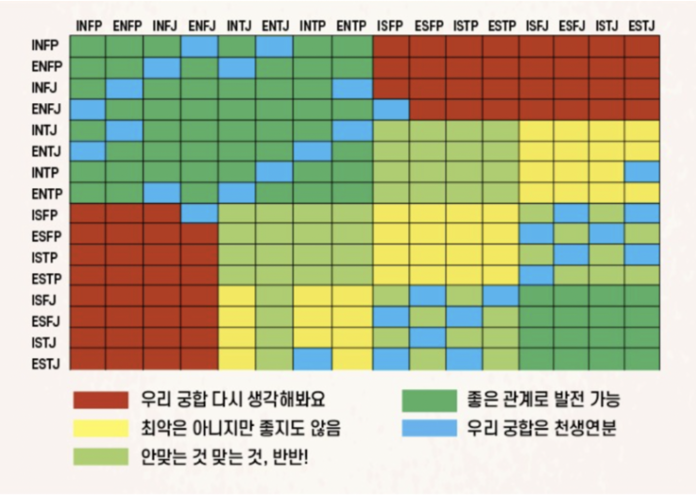 MBTI 궁합 표 또한 다양한 이미지들이 존재하지만 알아보기 편한 직관적인 이미지를 보여드릴게요.